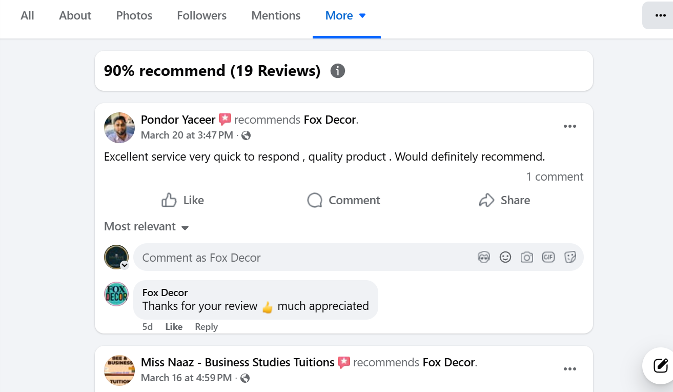 Happy to have 90% good review on Facebook among 19 recommendations. Thanks a lot for your trust!